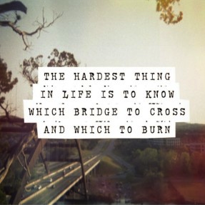 Life leaves us with bridges all the time the only question we have to ask ourselves is whether or not we should cross that bridge. It’s one of those judgement calls we are forced to make. Sometimes it works out for the better and other times it just turns out for the worse. The most unfortunate thing in life is missing out on an opportunity. It’s not always opportunities for bridges to come up. Sometimes it’s friendships, relationships or career related. What seems like a healthy friendship can quickly become toxic and before you know it another bridge has appeared. Do you continue walking the friendship bridge or do you need to cross the bridge and start walking a new one? There are so many decisions we have forced upon us. It’s never easy to know which choice is the right one to make but life is way too short to have negative feelings forced upon you. If someone is making you feel bad, your job or a relationship is having negative effects on you life it is definitely time to start thinking about which bridge you want to take.